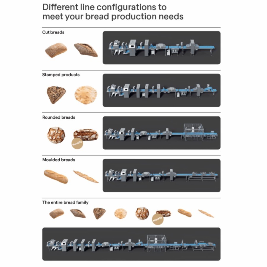 המערך מאפשר ייצור מגוון סוגי לחמים – חתוכים, מוטבעים, מעוצבים ומעוגלים – ומספק ביצועים גבוהים עם רמת גמישות מרבית.